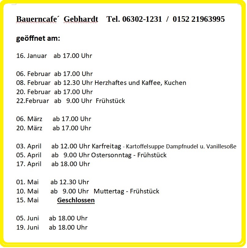 Hier findet Ihr alle wichtigen Neuigkeiten !Nach Termin Absprache öffnen wir für ihre Gruppe oder für ihre Feierlichkeiten!Kuchen und Torten backen wir für Sie auf Bestellung.Danke für ihren Anruf. Eure Familie Gebhardt.![]() Termine:nähere Info unter 06302-1231.Jeden 1. und 3. Freitag im Monat ab 19.00 Uhr ist das Cafè geöffnet.Auf Euer Kommen freut sich Familie Gebhardt mit Team. |